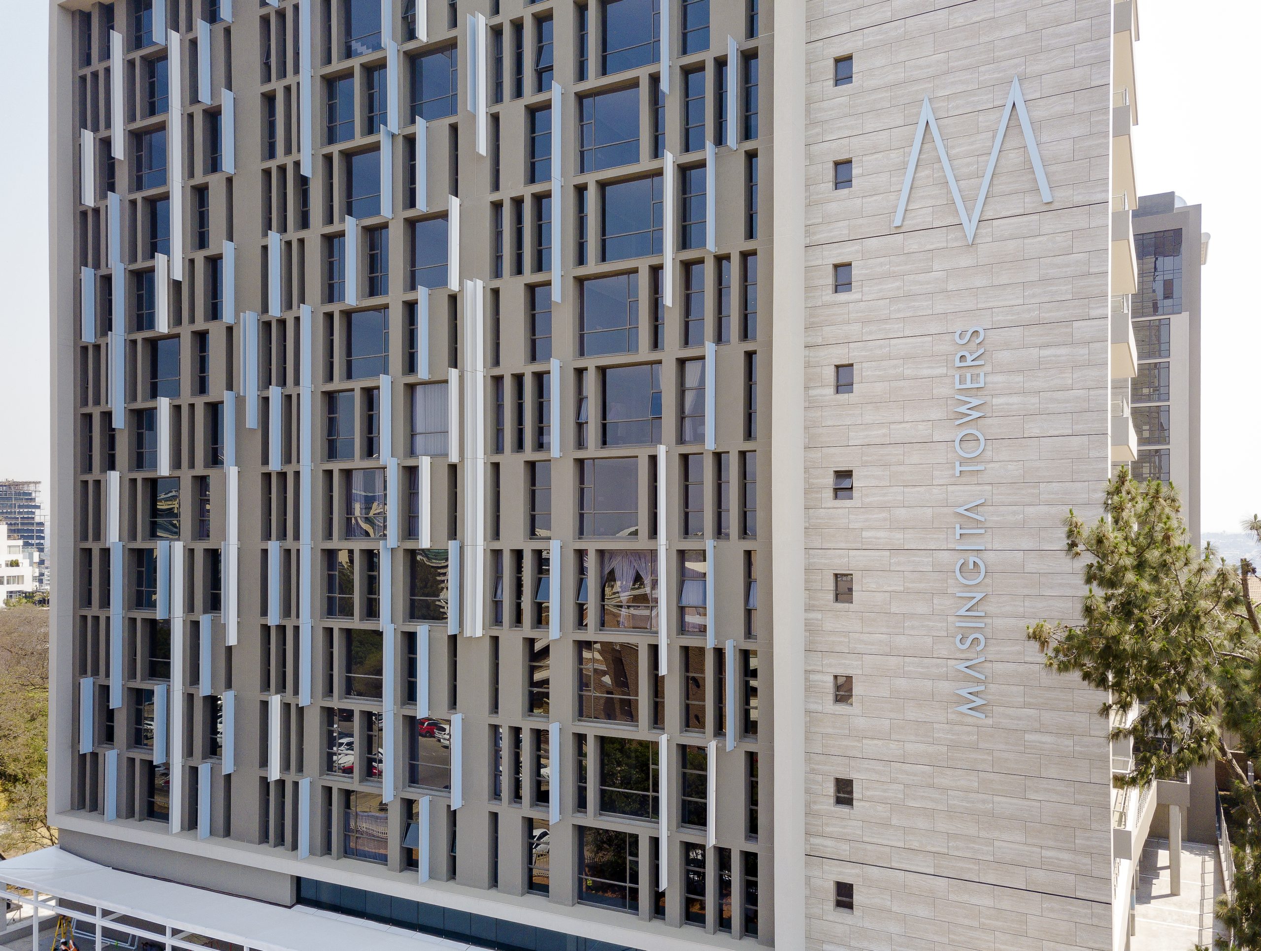 Masingita Towers is a 15-storey luxury high-rise residential development consisting of 174 units, with nine different unit types and penthouses. The inspiration was to create contemporary cosmopolitan apartments positioned on the most sought-after road in the heart of Sandton. The developer intended to create a "live, work, play" lifestyle by providing amenities such as a private fitness centre, executive conference facilities, a trendy restaurant, a luxurious pool area with a landscaped deck,